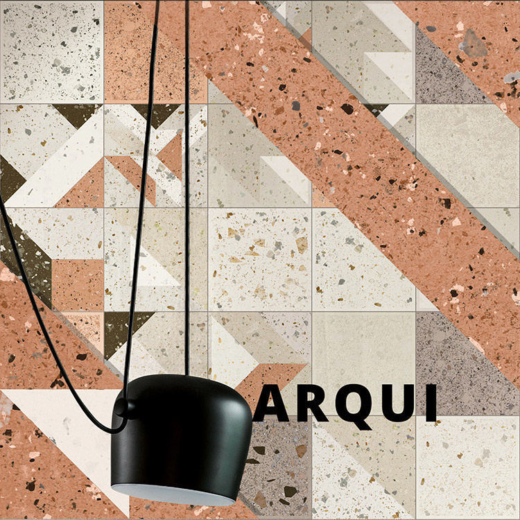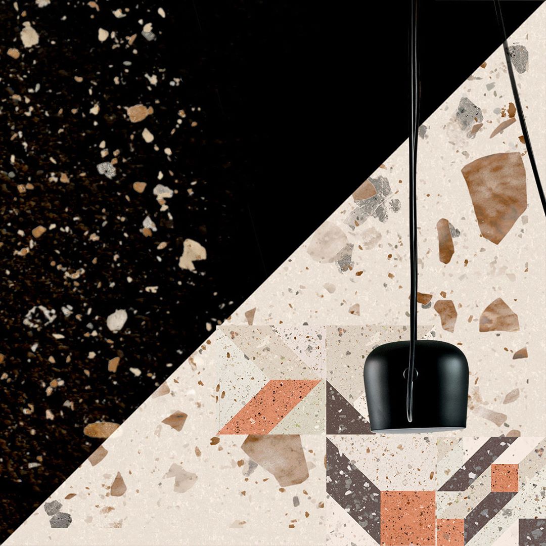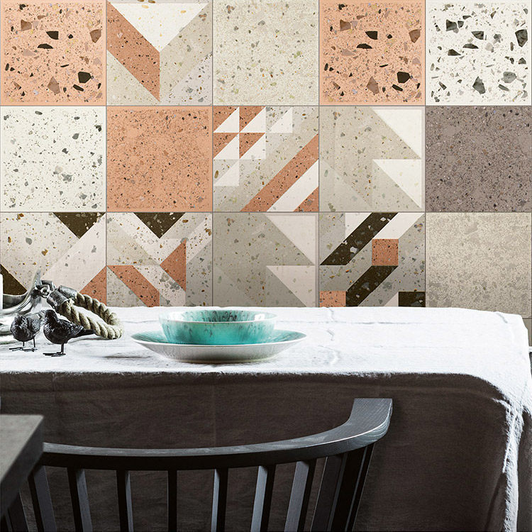 Le piastrelle esclusivamente quadrate, unite alla finitura granigliato in stile pavimento terrazzo e l’approccio grafico geometrico permettono infinite combinazioni in grado di abbracciare il gusto di chi predilige uno o più di questi singoli elementi.