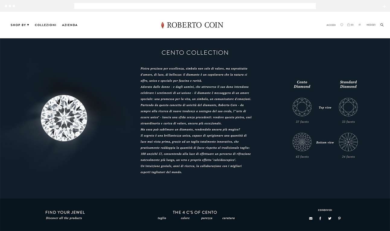 La Collezione Cento, fiore all’occhiello della produzione, così denominata per il taglio unico dei diamanti a 100 facce, richiedeva di essere raccontata con un altrettanto… taglio unico.