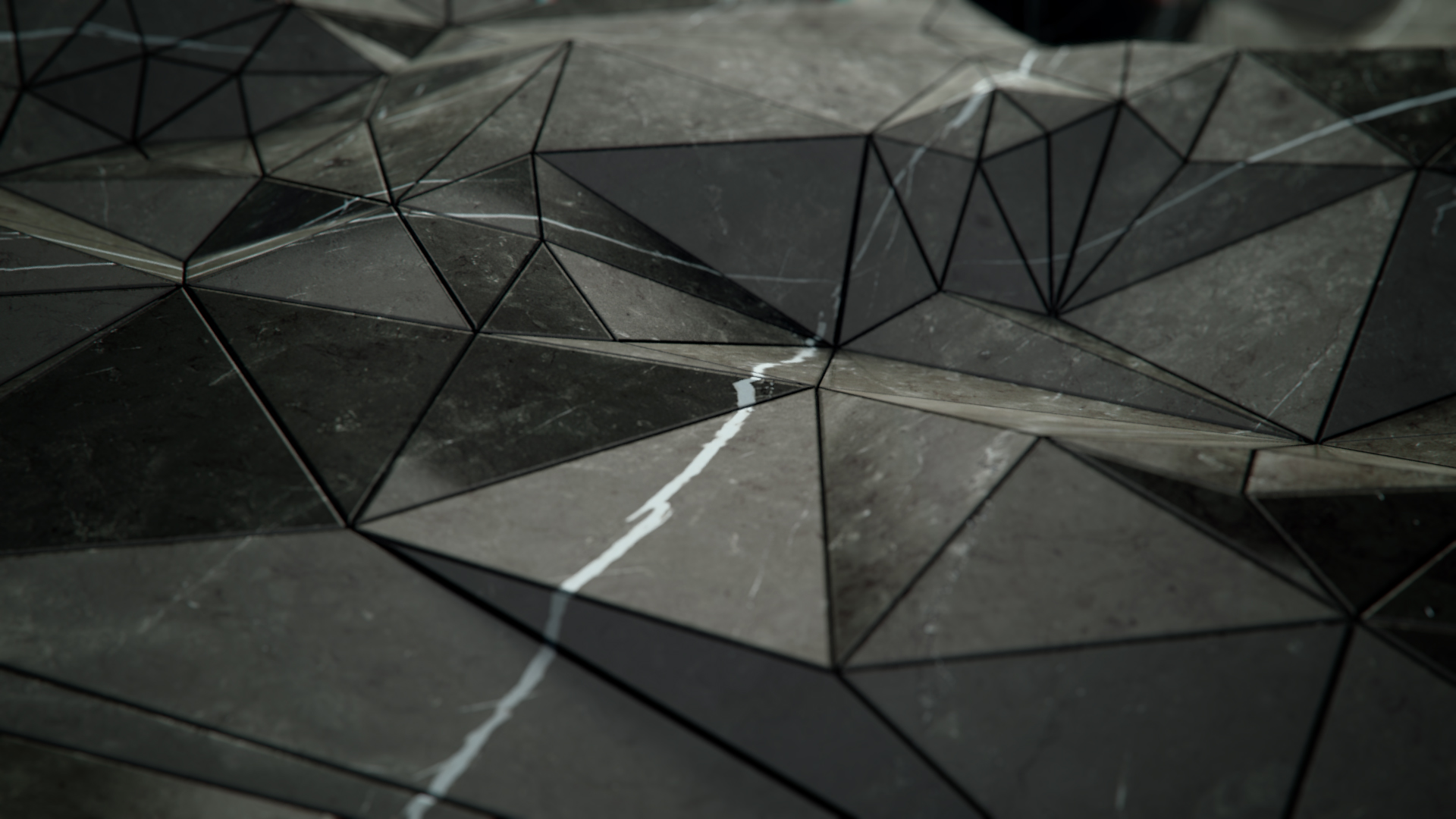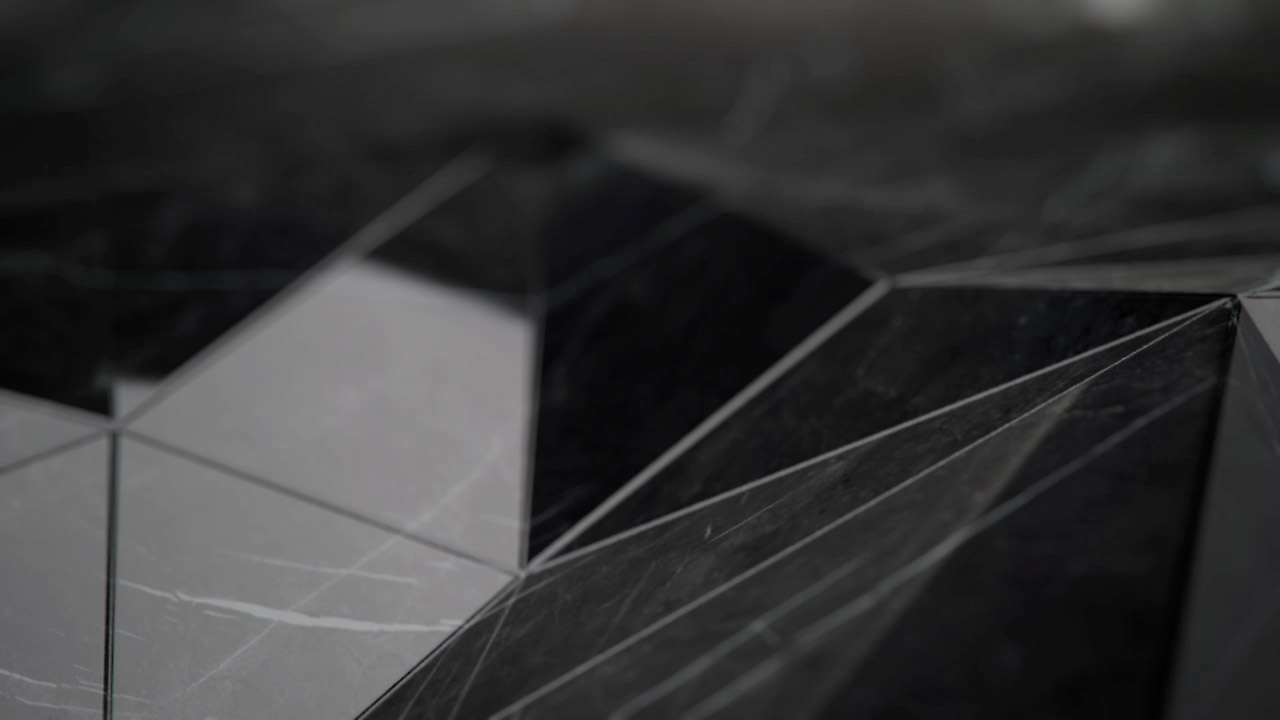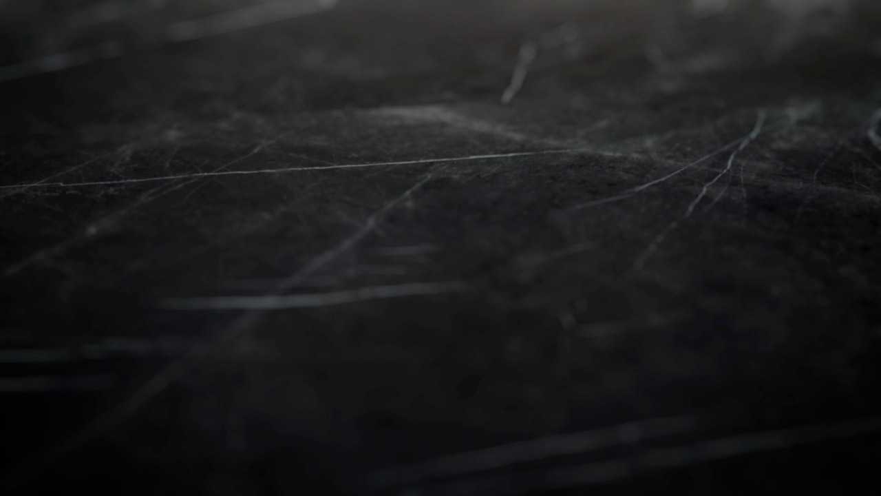 Una scena rarefatta e lenta presenta una superficie dapprima nera, poi si rivela essere di marmo venato di bianco;