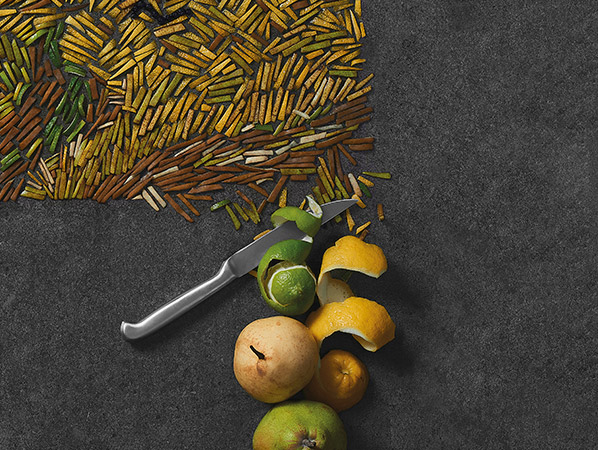 It was a crazy long process and a real challenge for our patience cutting hundreds of peel slices and put them together, each one of those simulating a brush stroke.
